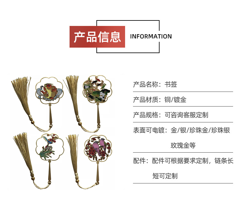 創(chuàng)意設(shè)計(jì):此款金屬鏤空小書(shū)夾國(guó)潮風(fēng)文創(chuàng)Logo書(shū)簽,以國(guó)潮文化花鳥(niǎo)、鯉魚(yú)等為元素,采用金屬鏤空工藝制作而成,外觀精美,做工精致,而且客戶(hù)可根據(jù)需求選擇流蘇尾LOGO標(biāo)識(shí),或者添加圖片文字進(jìn)行個(gè)性化定制服務(wù),讓每個(gè)書(shū)簽都獨(dú)具特色。