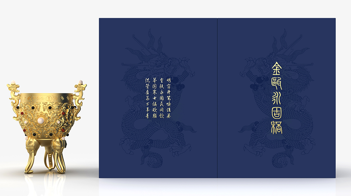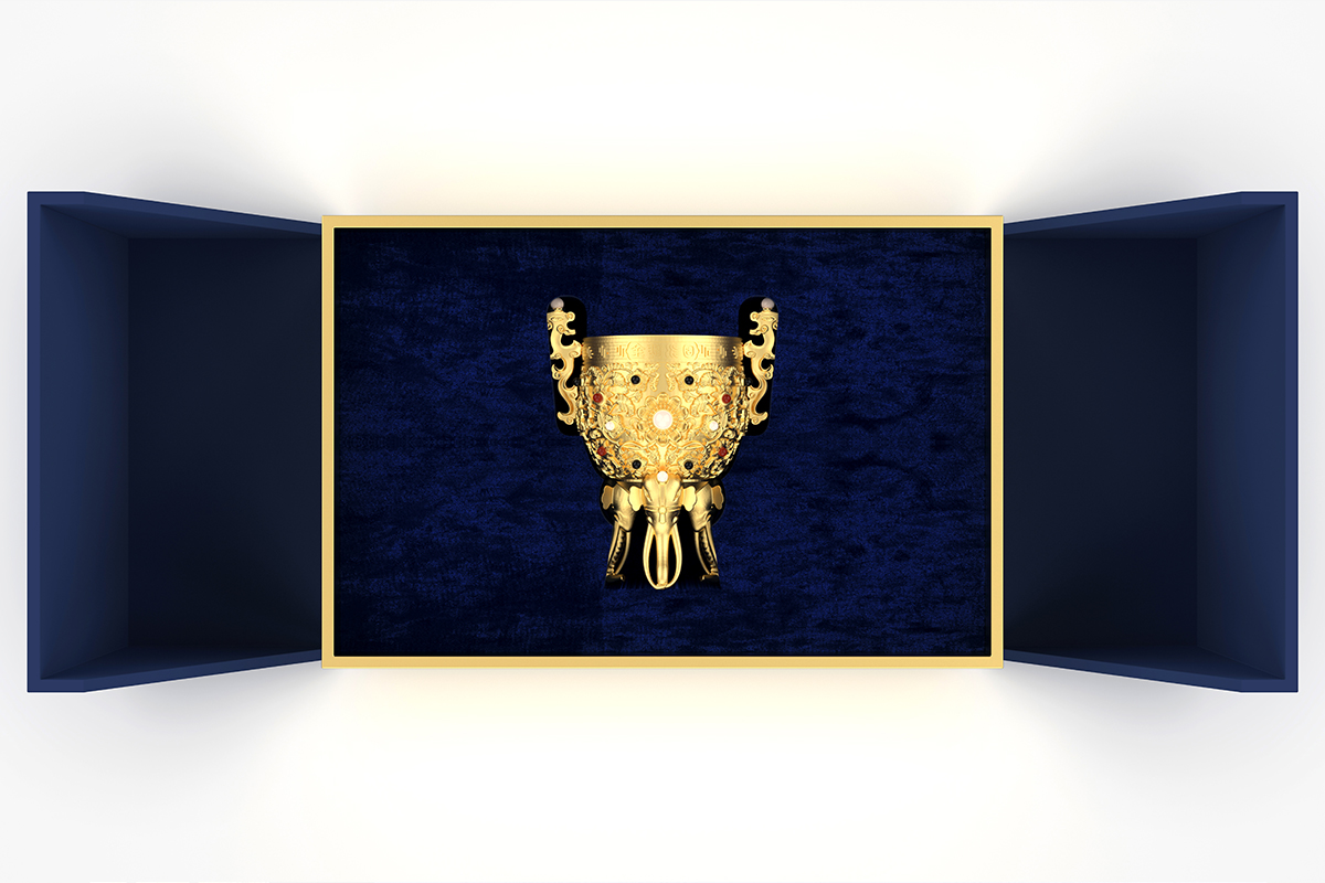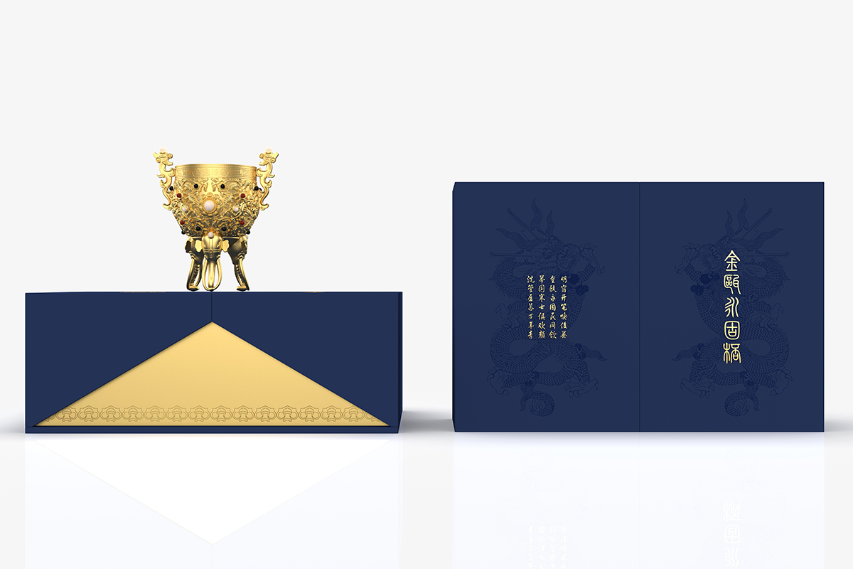 創(chuàng)意設(shè)計:此款酒具文創(chuàng)商務隨手禮是以故宮金甌永固杯為原型,設(shè)計制作的一款文創(chuàng)產(chǎn)品,整體造型以夔龍作為杯身兩邊的耳,龍頭上鑲嵌了珍珠,杯腿的設(shè)計用了三只象首,而三只大象的卷鼻分別作為杯子的立足支點。